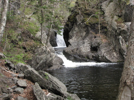 To help orient you, the retreat Lookout is smack in the middle of this pic taken from a mountain trail about a mile away on the way to Otter Brook and Pollets Cove. At the very bottom right edge, that little patch of smooth green is where the road ends and folks park to begin the hike I'm on, that's also where the rope goes down to the beach where you can walk back to the waterfall below the house (pic below). Middle left are my closest neighbors' houses who live right along the road. And all the red roofs behind the Lookout and going up the road are the various retreat cabins and other parts of Gampo Abbey.