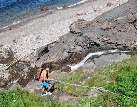 The nearest beach access is Archies Brook—a 10 minute walk from the Lookout to where the road ends and the Pollets Cove trail begins. Looks scary first time you go down but not as hard as you'd think, and coming up is easier. Bring a picnic for an afternoon of swimming in warm saltwater and hanging out on some big rocks, then rinsing off with cold fresh in one of the pools right here before you walk back home. The ocean temps reach the 70s in the summertime! If the wind and seas are calm enough in late June, July, Aug, and even early September, and the sun's out it's time for a swim! I could spend a week doing this every day being perfectly content without going anywhere or doing anything else. The beach here is stony but very private. You'll want to wear sneakers, Tevas, or watershoes to keep your footing in the water. (guest photo)